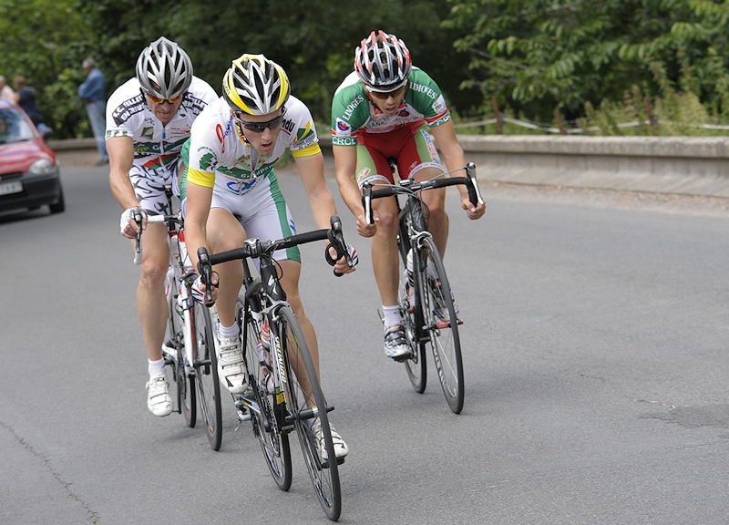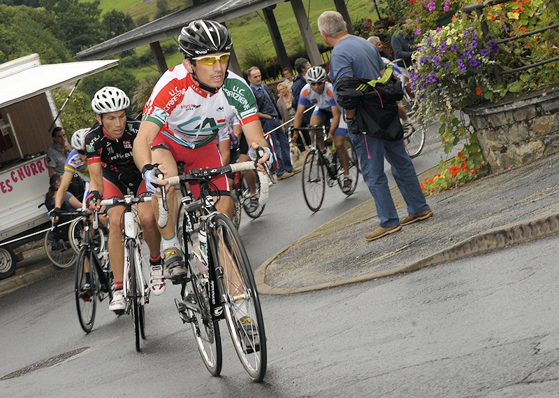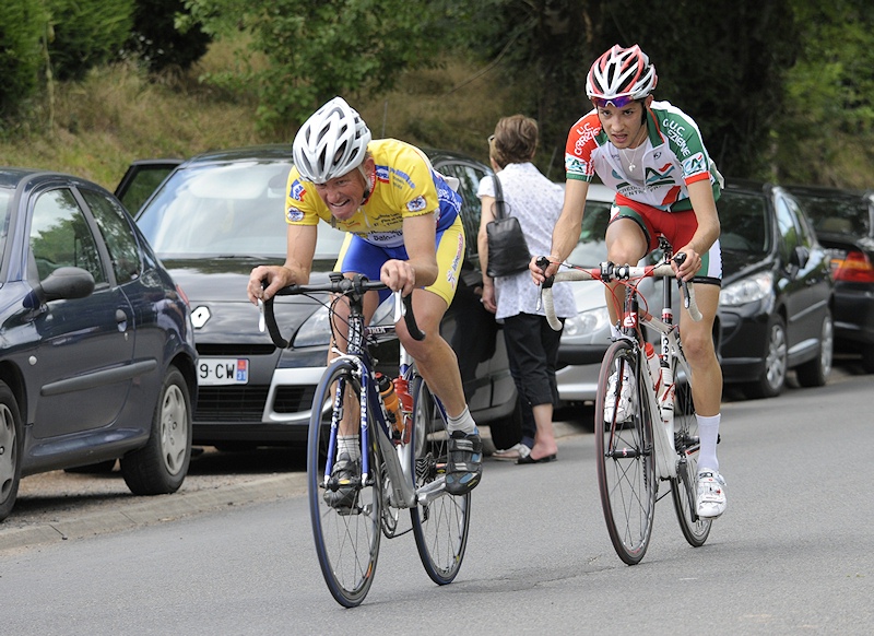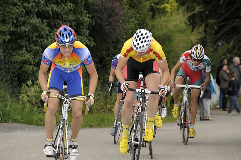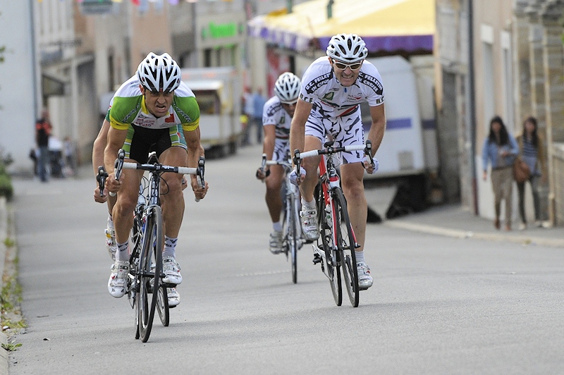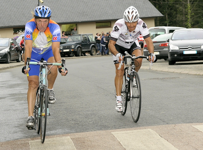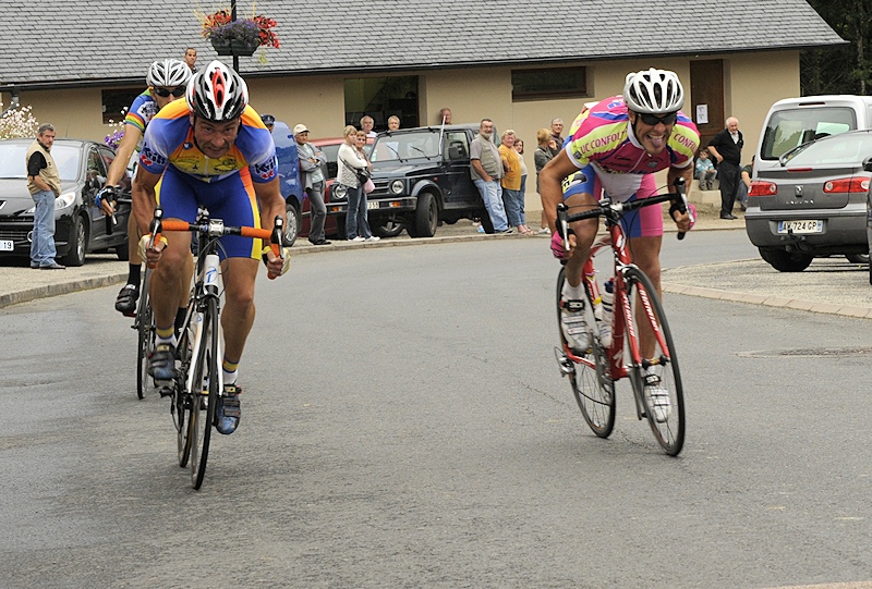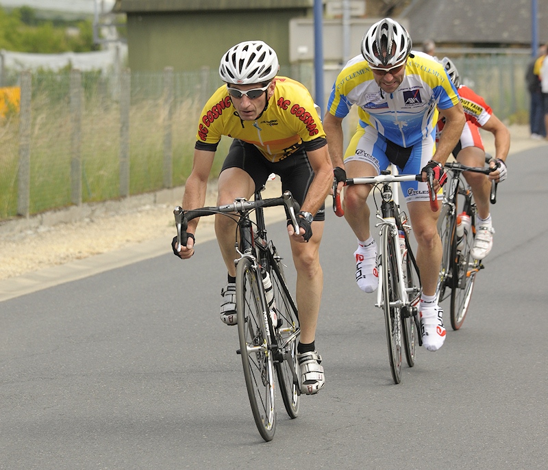 Dans les catégories où il était plus difficile de dégager des noms pour les titres, le suspense n’a pas été moindre, sauf en 17/19, J. Camus ayant pris les choses en mains pour ne pas prendre des risques. Il l’emportait facilement devant J. Raynaud et K. Benard. Les 15/16 arrivaient à 3 pour le podium, D. Breux lançait le sprint à l’entrée du bourg mais D. Betoulle restait dans sa roue et le coiffait au dernier moment, laissant la 3ème place à P. Lucas. Le peloton des 50 et + restait longtemps groupé malgré beaucoup d’attaques en début de course. Après le dernier passage sur la ligne, B. Menier sortait tranquillement, rejoint par D. Klein, puis par E. Monjoffre. Les 3 se présentaient ainsi pour l’arrivée et là encore les ultimes coups de pédale faisaient la décision : Klein-Monjoffre-Menier.