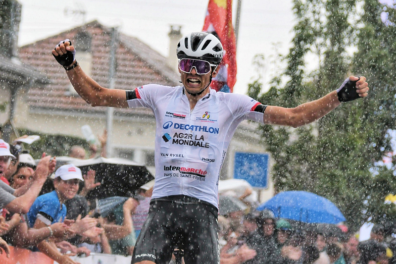 Alors que l'orage a décidé de s'inviter à la fête, Alex BAUDIN augmente son avance. A 3 kms de la'rrivée, il compte plus de 30 secondes d'avance. Alors que la pluie redouble dans ces derniers kilomètres, Alex BAUDIN va cueillir une belle victoire et s'empare par la même de la tunique jaune de leader.