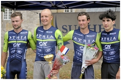 Mickaël GUICHARD (Team Atria Montlucon) s'impose au sommet de Lissac sur Couze (19) en ce lundi 14 juillet. Echappé dès les premiers tours, il termine en solitaire. Un feu d'artifice de l'équipe Atria à l'arrivée qui s'offre les quatre premières places. Plus de 90 photos disponibles !