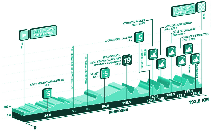Cette 2ème étape mène les coureurs de Saint-Aulaye-Puymangou (24) à Terrasson (24) pour 194 kms. Plusieurs attaques en début de course mais un groupe de huit hommes arrive finalement à s'extirper du reste de la troupe. Il y a Morne VAN NIEKERK (Auber 93), Célestin GUILLON (Van Rysel-Roubaix), Martin MARCELLUSI (VF Bardiani Faizane), Lennert TEUGELS (Bingoal),Alexis GOUGEARD (Cofidis), Vinzent DORN (Bike Aid), Sergio CHUMIL GONZALEZ (Burgos) et Mirco MAESTRI (Polti-Kometa).