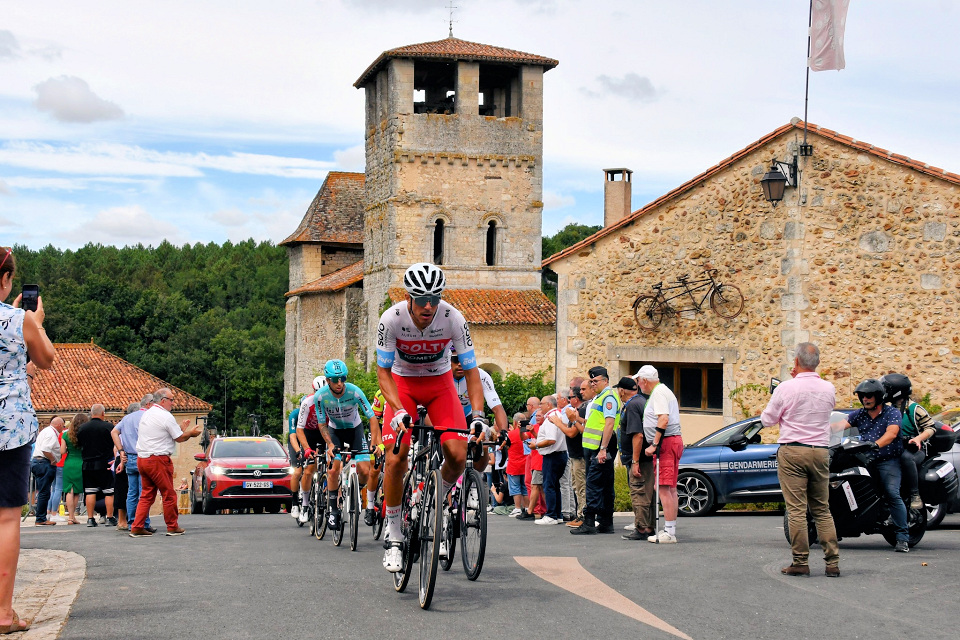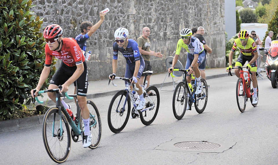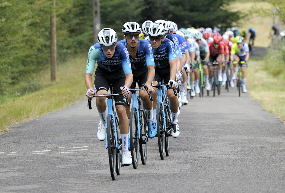 Il reste 55 kms et l'échappée est terminée. Lenny MARTINEZ (Groupama-FDJ), Louka MATTHYS (Bingoal-WB), Kevin COLLEONI (Intermarché-Wanty) et Embret SVESTAD-BARDSENG (Arkéa-B&B Hôtels) ouvrent désormais la route et franchissent une première fois la ligne à Argentat avec 20 secondes d'avance sur un peloton très allégé.