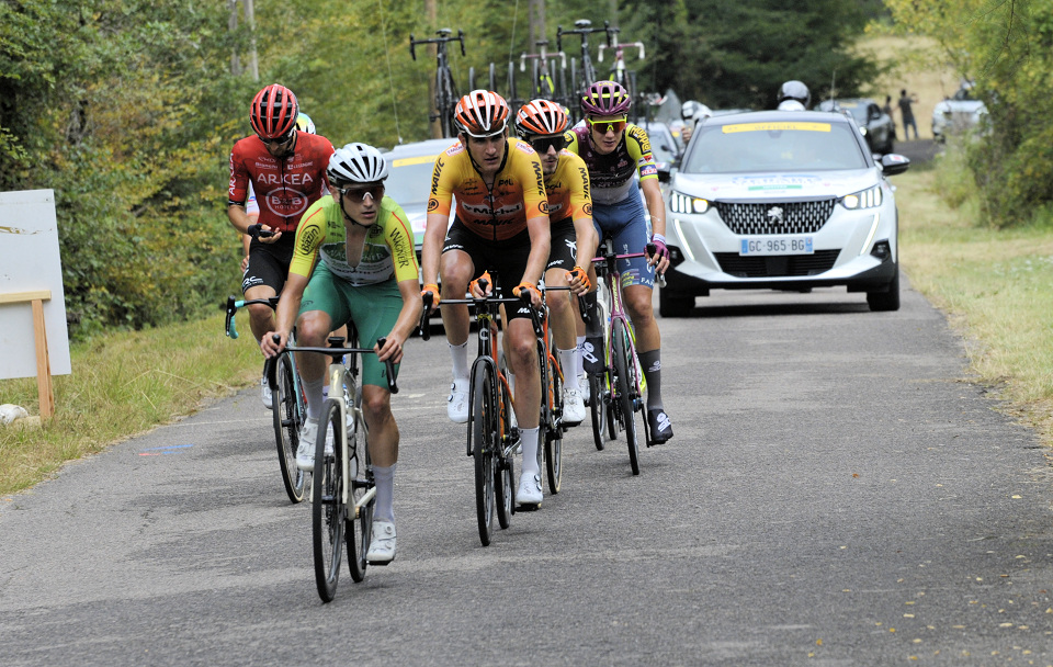 Le groupe de tête continue à se disloquer et la jonction est imminente alors que l'on entre dans les dix derniers kilomètres. Mais au passage du dernier MG, les quatre hommes de tête ont toujours la minute d'avance. Plsuieurs hommes sortent du peloton et reviennent à l'avant. A 8 kms du final, l'échappée est terminée. Dans le dernier MG du jour, la côte de beauregard, Alex BAUDIN (Décathlon AG2R La Mondiale) prend quelques mètres d'avance.