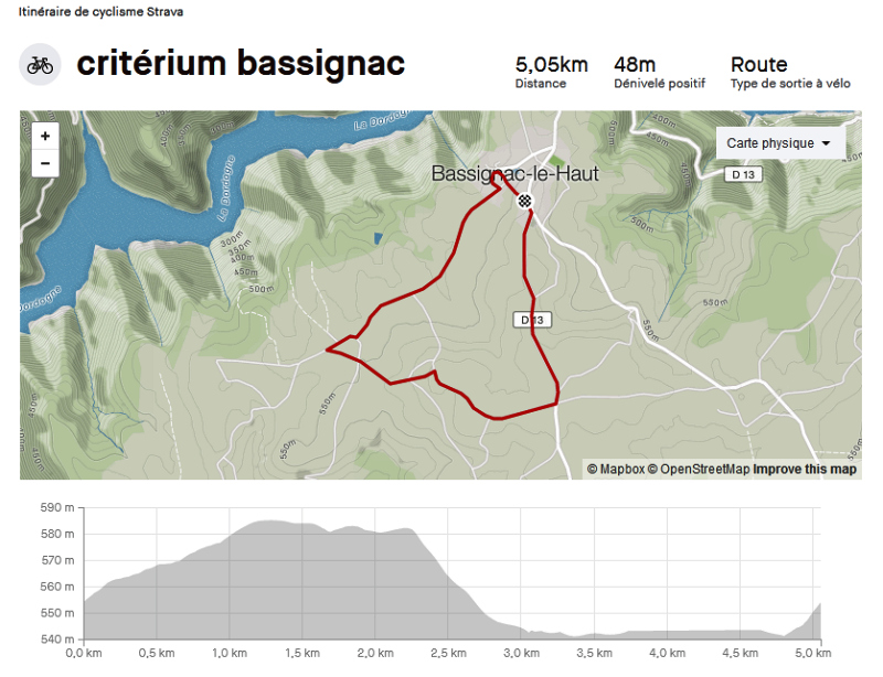 Le 1er août, Bassignac le Haut accueillera de nouveau une épreuve cycliste. Le criterium de Bassiganc se dispoutera sur un circuit plus court que celui du championnat mais tout aussi agréable. Vous pouvez découvrir ci-dessous la vidéo du circuit ainsi que son profil