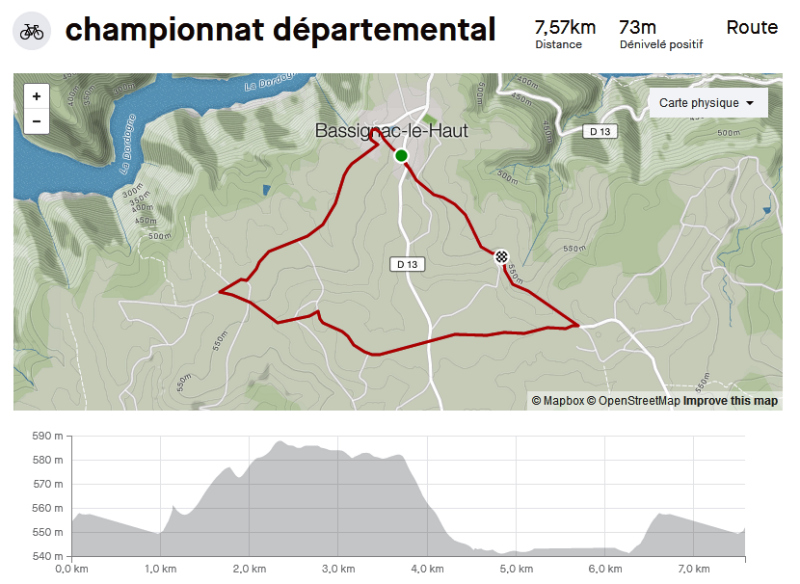 Le championnat départemental Corrèze Cyclosport UFOLEP 2020 se déroulera autour de la commune de Bassignac le Haut le dimanche 17 mai. Le circuit est accidenté et permettra à tout un chacun de s'y retrouvé. L'organisateur a bien fait les choses en proposant dès aujourd'hui une vidéo du parcours ainsi qu'un profil sur STRAVA.