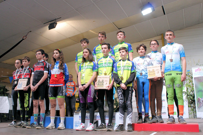 Les cadets, après une belle course ne pouvaient se voir classés que 19ème pour Louis MARCENAC, 20 pour Elian VALADOU, Baptiste ROUMANIOL 23, après avoir été retardés par la chute de leur camarade Bastien VUARAND. Romain LABORIE et Clément ESTIVAL arrivaient plus loin. En benjamins Antoine ROUMANIOL montait sur la troisième marche du podium.