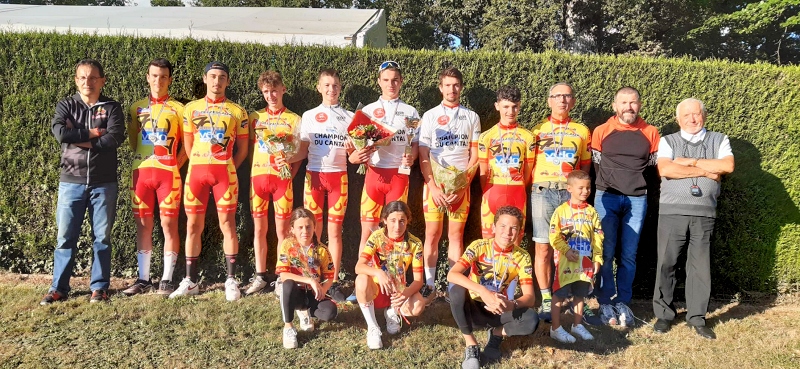 Les Championnats du Cantal sur route ont eu lieu, pandémie oblige, comme l’an passé le premier samedi de septembre. L’ACVA a fait la moisson de médailles, à commencer par Alice RAYMOND et Yanis BARBET en école de cyclisme. Léo CHARBONNEL terminait second en Benjamins. Marie RAYMOND prenait part à la course minime. En cadets, Elian VALADOU devançait Antoine VERHAEGHE avec qui il était échappé, Valentin TEULIERE montait sur la troisième marche du podium.