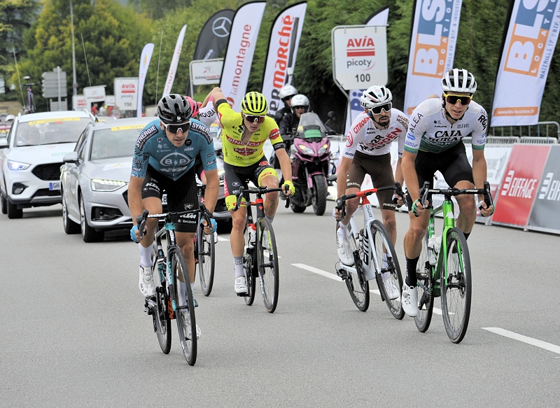 Valentin MADOUAS franchit seul en tête la côte de Vertougit, 3ème MG du jour. A 30 kms de l'arrivée, Valentin MADOUAS compte 45" d'avance sur Dimitri CLAEYS et Lorenzo ROTA (Intermarché Wanty Gobert) et 1' sur un peloton réduit dans lequel se trouve la maillot jaune. A 18 kms de l'arrivée, Benoist COSNEFROY (AG2R Citroën) rejoint l'homme de tête à l'avant de la course. Le maillot jaune décide de faire son effort afin de faire la jonction avec les deux hommes de tête.