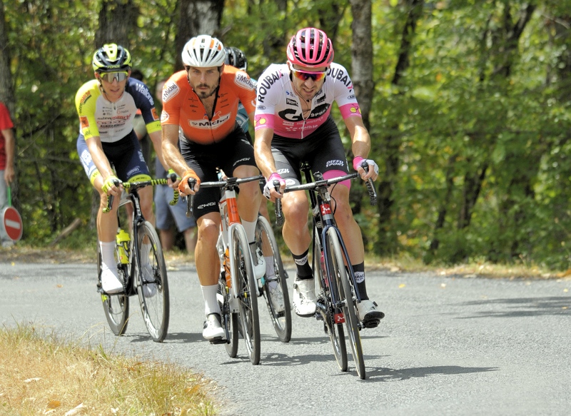 Derrière, le groupe de contre a été repris. Alessandro COVI(UAE) est intercalé entre les échappées et le peloton. Les hommes de tête possèdent toujours plus de 5 minutes d'avance après 60 kms de course. La côte de Siorac de Ribérac se profile et Maxime URRUTY se dresse sur ses pédales pour franchir en solitaire le sommet et glaner les points de la montagne. Kévin BESSON (Nice Métropole) prend avec une dizaine de seconde d'avance sur le peloton au sommet de ce deuxième MG de la journée.