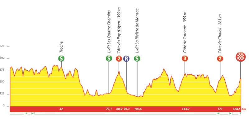 La côte d'Ayen, première difficulé du jour, se passe au train sous la conduite de Julien DUVAL qui passe en tête au sommet. Le dernier sprint intermédiaire situé à la Rivière de Mansac (km 103) est de nouveau remporté par Baptiste PLANCKAERT.