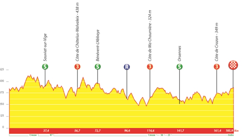 Au deuxième sprint intermédiaire à Bénévent L'Abbaye (km 73), Florian VACHON s'impose devant Rudy MOLARD et Clément SAINT-MARTIN. Au passage ils glanent de précieuses bonnifications. L'avance des échappés est désormais de 3'50". Il reste encore 100 bornes à parcourir et l'écart passe les 4 minutes d'avance. Il monte même à 5 minutes à 80 kilomètres de l'arrivée.