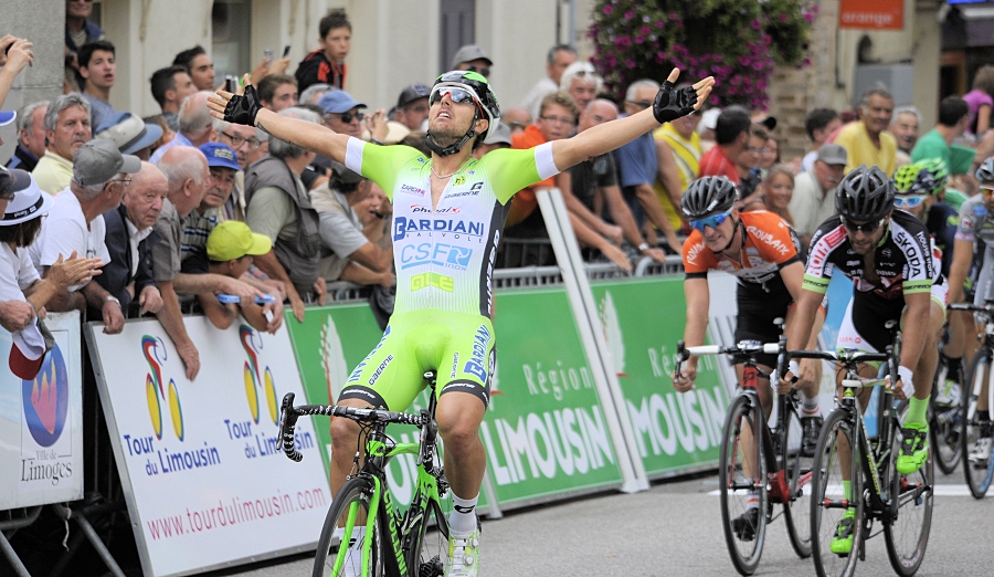 Dans les quinze derniers kilomètres plusieurs attaquent se font jour mais aucune ne prend en défaut un peloton très concentré. Une arrivée massive est alors inévitable. Le jeune sprinter de l'équipe Bardiani CSF, Sonny COLBRELLI, franchit la ligne au bout d'un sprint bien maîtrisé et revêt le premier maillot jaune de ce Tour du Limousin 2015. Le vainqueur a été copieusement applaudi par le très nombreux public de Saint-Yrieix la Perche. Le podium du jour est complété par Andréa PASQUALON (Roth Skoda) et Timothy DUPONT (Roubaix Lille Métropole). Le premier tricolore est David MENUT (Auber 93) qui termine 8ème de cette étape.