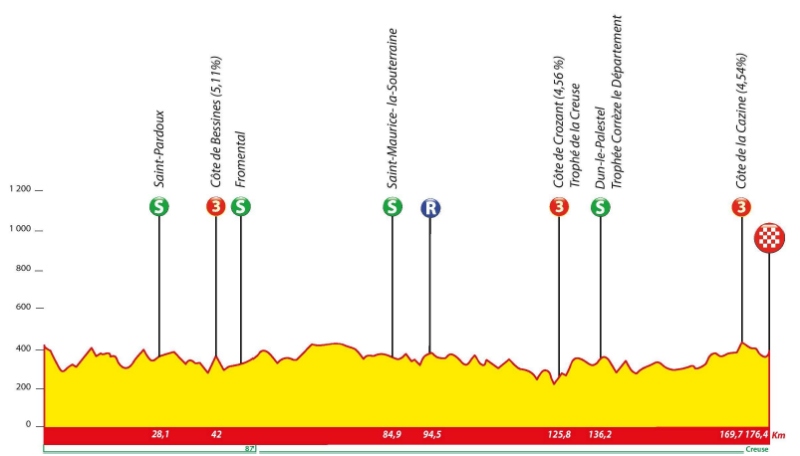 Les averses se succèdent sur le parcours et malgré le rythme de poursuite imposé par les équipe Movistar et Groupama FDJ, l'écart est toujours de près de 6 minutes à 80 kms de l'arrivée à La Souterraine. Joël NICOLAU BELTRAN (Caja Rural) passe en tête du deuxième grimpeur de la journée davant Kenny MOLLY (Bingoal). Peu après le MG, Alexis GOUGEARD (B&B Hôtels) est victime d'une crevaison qui lui sera fatale. Dans le même temps, Benoîst COSNEFROY (AG2R) et Guillaume MARTIN (Cofidis) sont victimes d'une chute mais reintégrerons le peloton quelques kilmomètres plus loin.