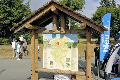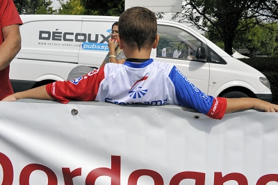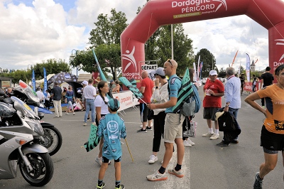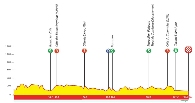 Si Maël GUEGAN remporte le sprint intermédiaire en tête de course, la troisième place est très disputée dans le peloton pur glaner les secondes de bonification. Sur le premier passage à Ribérac les deux hommes de tête ont toujours une confortable avance de plus de 5 minutes mais le peloton semble réagir et le rythme s'est considérablement amplifié. A 70 kms de l'arrivée l'écart se réduit sous l'impulsion des équipes de sprinters. Les hommes de tête ont un peu moins de 4 minutes d'avance.