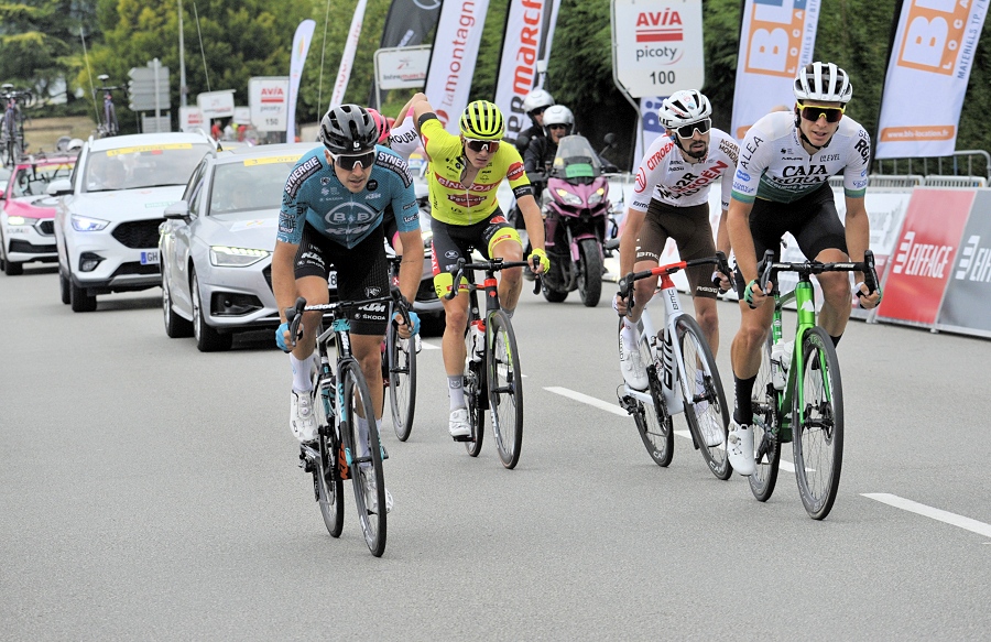 Valentin MADOUAS franchit seul en tête la côte de Vertougit, 3ème MG du jour. A 30 kms de l'arrivée, Valentin MADOUAS compte 45" d'avance sur Dimitri CLAEYS et Lorenzo ROTA (Intermarché Wanty Gobert) et 1' sur un peloton réduit dans lequel se trouve la maillot jaune. A 18 kms de l'arrivée, Benoist COSNEFROY (AG2R Citroën) rejoint l'homme de tête à l'avant de la course. Le maillot jaune décide de faire son effort afin de faire la jonction avec les deux hommes de tête.